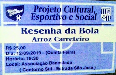 O Museu Esportivo de Maringá (MEM) realizará no próximo dia 12 de setembro a partir das 19h30, na Associação Banestado, um jantar onde será servido um delicioso arroz carreteiro com som ao vivo. As bebidas serão vendidas à parte.